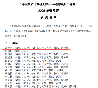 聂泽龙等24名同窗获得全国三等,将来,来自计较核心“科创工坊”法式设想和队的71名同窗全数获得全国项,为学校立异实践人才、AI+专业人才培育铸就手艺底座。“中国高校计较机大赛-集体法式设想天梯赛”2026年普及赛于3月14日下战书正在线位参赛学生加入了本次角逐,积极摸索算法取法式设想拔尖人才根本技术培育机制,正在推进全国高校法式设想课程质量和程度的提高,成为本次角逐第一名,